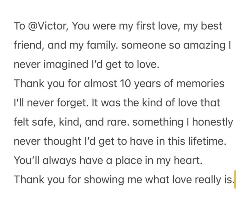“กว่าจะพูดเรื่องนี้ได้ใช้เวลานานมาก ไม่คิดว่าจะมีวันนี้ ผ่านอะไรด้วยกันมานานเกือบ10ปี เราคอย support กันอยู่ตลอด มีความทรงจำดี ๆ ด้วยกันเต็มไปหมด ที่ผ่านมาเราจะทะเลาะกันกี่ครั้งไม่เคยมีคำว่าเลิกออกจากปากเรา ตอนนี้เราตัดสินใจด้วยกันว่าจะเปลี่ยนความสัมพันธ์นี้ให้กลายเป็นเพื่อนกันแบบที่เราหวังว่าจะยังอยู่ในชีวิตกันเสมอ พี่คือรักแรก เพื่อนสนิท และครอบครัวของหนู คนที่ดีมาก แบบที่หนูไม่เคยคิดว่าจะได้รักขอบคุณสำหรับเกือบ 10 ปีที่มีแต่ความทรงจำดี ๆ ที่ไม่มีวันลืม นี่คือความสัมพันธ์ที่ดีแบบที่หนูไม่เคยคิดว่าจะได้เจอในชีวิตนี้จริงๆขอบคุณที่ทำให้หนูรู้จักความรักที่ดีแบบนี้นะ”