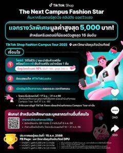 DPU ร่วมกับ TikTok Shop เปิดเวทีเฟ้นหาครีเอเตอร์รุ่นใหม่ ร่วมประกวดวิดีโอรีวิวสินค้าแฟชั่น ลุ้นรางวัลสูงสุด 5,000 บาท ปิดรับสมัครพรุ่งนี้!