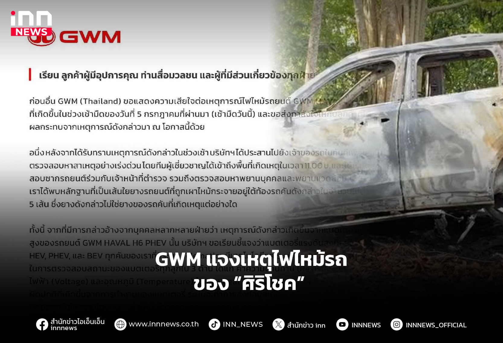 GWM Thailand ออกแถลงการณ์ชี้แจงกรณีไฟไหม้รถ HAVAL H6 PHEV ของ”ศิริโชค โสภา” ส่งทีมผู้เชี่ยวชาญตรวจสอบพบเส้นใยยางไหม้ใต้ท้องรถ 5 เส้น ไม่ใช่ของรถคันเกิดเหตุ ยันระบบแบตเตอรี่มีระบบตรวจสอบเรียลไทม์ ไม่พบความผิดปกติก่อนเกิดเหตุ
