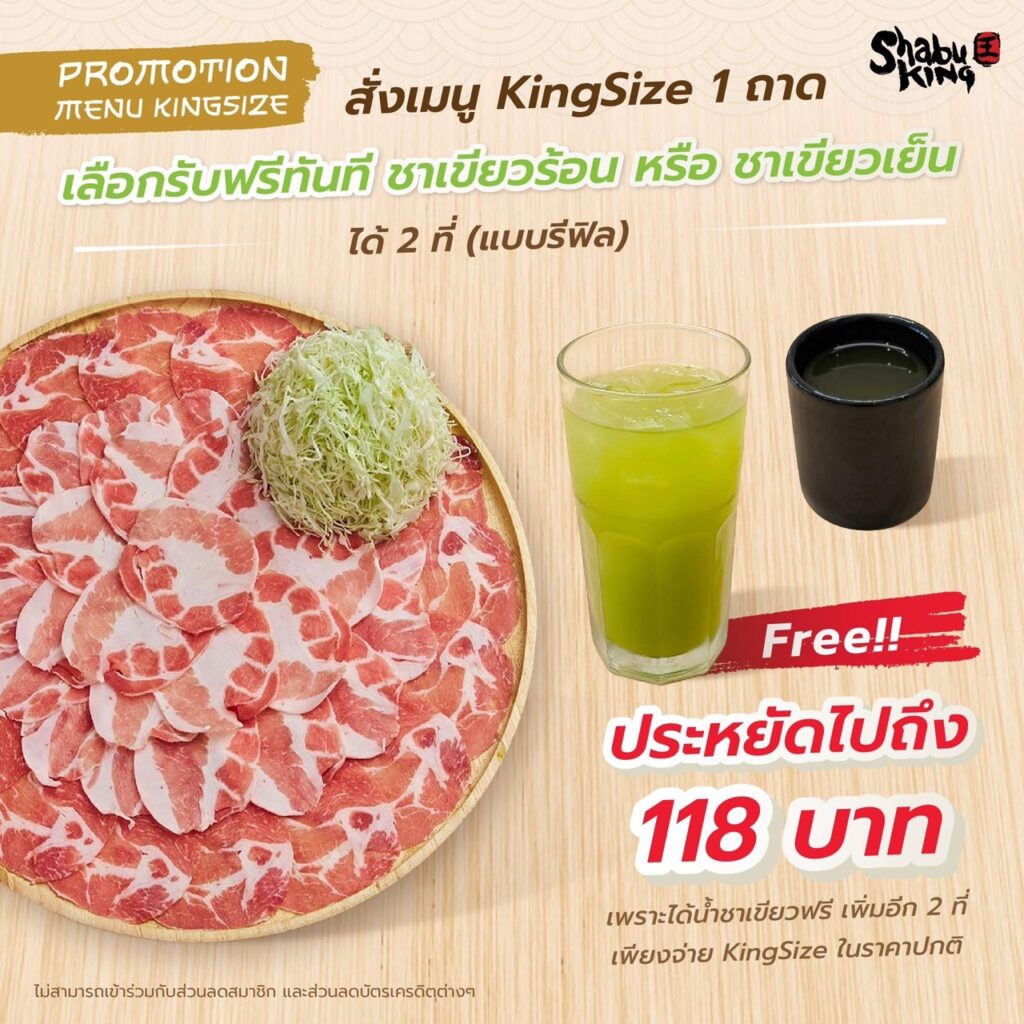 เจี๊ยบ พิจิตตรา “ สำหรับโปรโมชั่นพิเศษมาแล้ว‼️ เมนู Signature ของ Shabu King เมนู King Size เมื่อสั่ง King Size ไม่ว่าจะเป็น เนื้อ , หมู หรือ ทั้งเนื้อและหมูในถาดเดียวกัน รับทันที ชาเขียวร้อน ชาเขียวเย็น 2 ที่ไปทานให้ชื่นใจ ประหยัดไปถึง 118 บาท พร้อมเสิร์ฟตั้งแต่วันนี้ สายฟิต สายลีน หรือจะสายกิน ไม่ควรพลาด