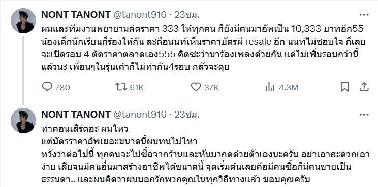 ล่าสุด “นนท์” ได้ออกโรงพูดถึงเรื่องนี้เองโดยการโพสต์ข้อความว่า “ผมและทีมงานพยายามคิดราคา 333 ให้ทุกคน ก็ยังมีคนมาอัพเป็น 10,333 บาทอีก55 น้องเด็กนักเรียนก็ร้องให้กัน ละคือนนท์เห็นราคาบัตรผี resale อีก นนท์ไม่ชอบใจ ก็เลยจะเปิดรอบ 4 ตัดราคาตลาดเอง555 คิดซะว่ามาร้องเพลงด้วยกัน แต่ไม่เพิ่มรอบกว่านี้แล้วนะ เพื่อนๆในรุ่นเค้าก็ไม่ทำกัน4รอบ กลัวจะตุย”