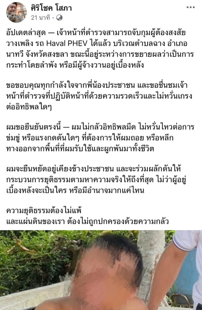 ล่าสุด (6 ก.ค. 68) นายศิริโชค โสภา โพสต์เฟซบุ๊ก Sirichok Sopha ระบุว่า เจ้าหน้าที่ตำรวจสามารถจับกุมผู้ต้องสงสัยวางเพลิง รถ Haval PHEV ได้แล้ว บริเวณตำบลฉาง อำเภอนาทวี จังหวัดสงขลาขณะนี้อยู่ระหว่างการขยายผลว่าเป็นการกระทำโดยลำพัง หรือมีผู้จ้างวานอยู่เบื้องหลัง