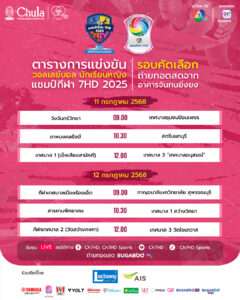 แฟนลูกยางรอเชียร์ได้เลย การแข่งขัน วอลเลย์บอล นักเรียนหญิง แชมป์กีฬา 7HD 2025 ครั้งที่ 8 โดย ช่อง 7HD จับมือ จุฬาลงกรณ์มหาวิทยาลัย จัดขึ้นเพื่อเปิดเวทีให้นักกีฬาได้แสดงศักยภาพ พร้อมเฟ้นหาดาวรุ่งดวงใหม่ให้กับวงการวอลเลย์บอลไทย สานฝันนักเรียนและเยาวชนในการก้าวสู่การเป็นนักกีฬาทีมชาติและอาชีพต่อไปในอนาคต พร้อมเปิดสนามให้ยอดนักตบลูกยางนักเรียนหญิงจากทั่วประเทศได้อวดฝีไม้ลายมือกันแล้ว หลังจากเปิดรับสมัครทีมโรงเรียนต่าง ๆ ทั่วประเทศ และทีมวางอีก 15 ทีม มาจากการจัดลำดับตามแรงกิง วอลเลย์บอลเยาวชนหญิง ชิงชนะเลิศแห่งประเทศไทย ประจำปี 2567 โดยนัดดวลพลังตบลูกยางชิงชัยรอบคัดเลือก รอบแรก เป็นการแข่งขันแบบน็อกเอาต์ แพ้ตกรอบทันที! ซึ่งจะทำการแข่งขันในวันที่ 11-12 กรกฎาคม 2568 (แข่งขันทุกวัน) วันละ 3 คู่ เริ่มคู่แรก 09.00 น.) โปรแกรมการแข่งขันมีดังนี้