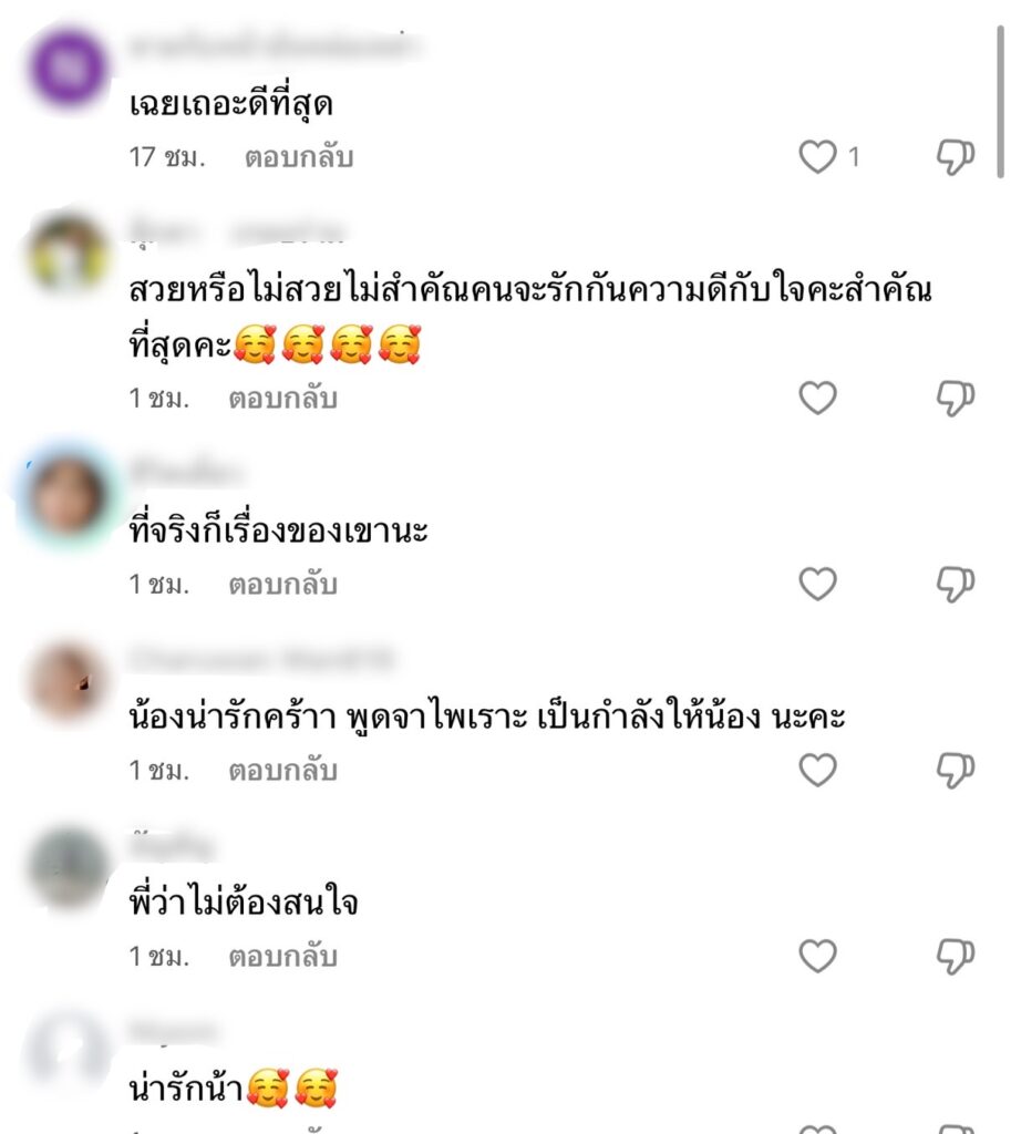 ท่ามกลางแฟนคลับเข้ามาส่งกำลังใจให้สาว“จอย” เป็นจำนวนมากเพราะความสวยของแต่ละคนไม่เหมือนกัน อาทิ “สวยหรือไม่สวยไม่สำคัณคนจะรักกันความดีกับใจคะสำคัณที่สุดคะ , น้องน่ารักคร้าา พูดจาไพเราะ เป็นกำลังให้น้อง นะคะ , ที่จริงก็เรื่องของเขานะ, อย่าสนใจใคร สนใจแค่แฟนตัวเองพอครับ “ และอีกมากมาย