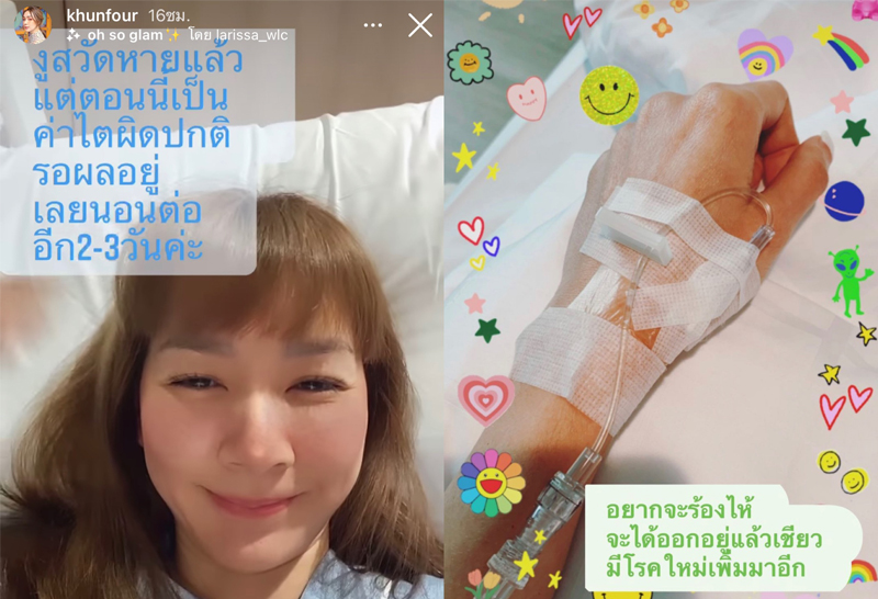 ทำเอาแฟนๆอดเป็นห่วงไม่ได้ เมื่อสาวโฟร์ -ศกลรัตน์ โพสต์ไอจีสตรอรี่ขณะนอนพักรักษาตัวที่โรงพยาบาล พร้อมระบุว่า “อยากจะร้องไห้ จะได้ออกอยู่แล้วเชียว มีโรคใหม่เพิ่มมาอีก”