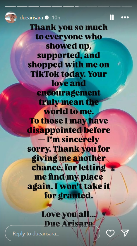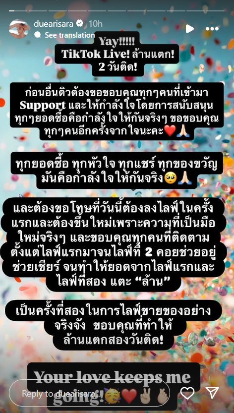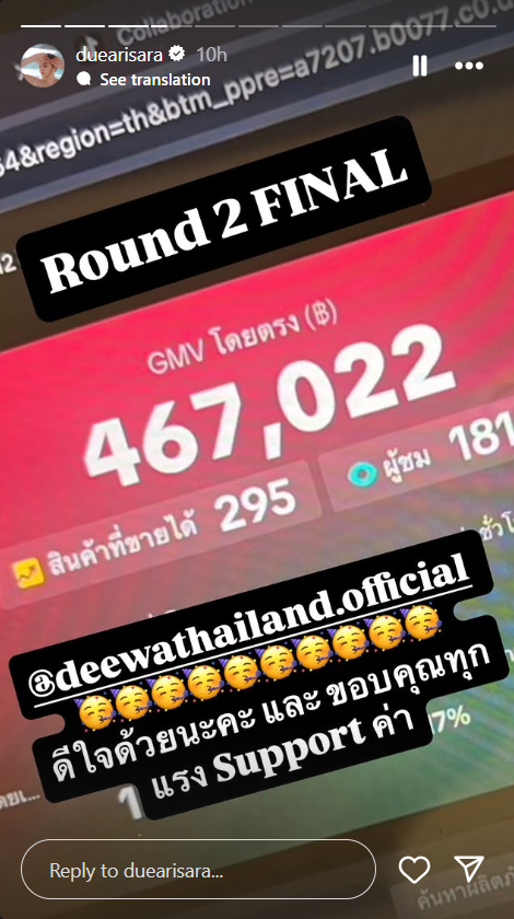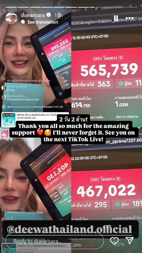 อีกทั้งยังได้โพสต์สตอรี่ยอดขายจากการไลฟ์สด 2 วันได้ 2 ล้านบาท พร้อมข้อความขอบคุณว่า “Thank you all so much for the amazing support I’ll never forget it. See you on the next TikTok Live!”