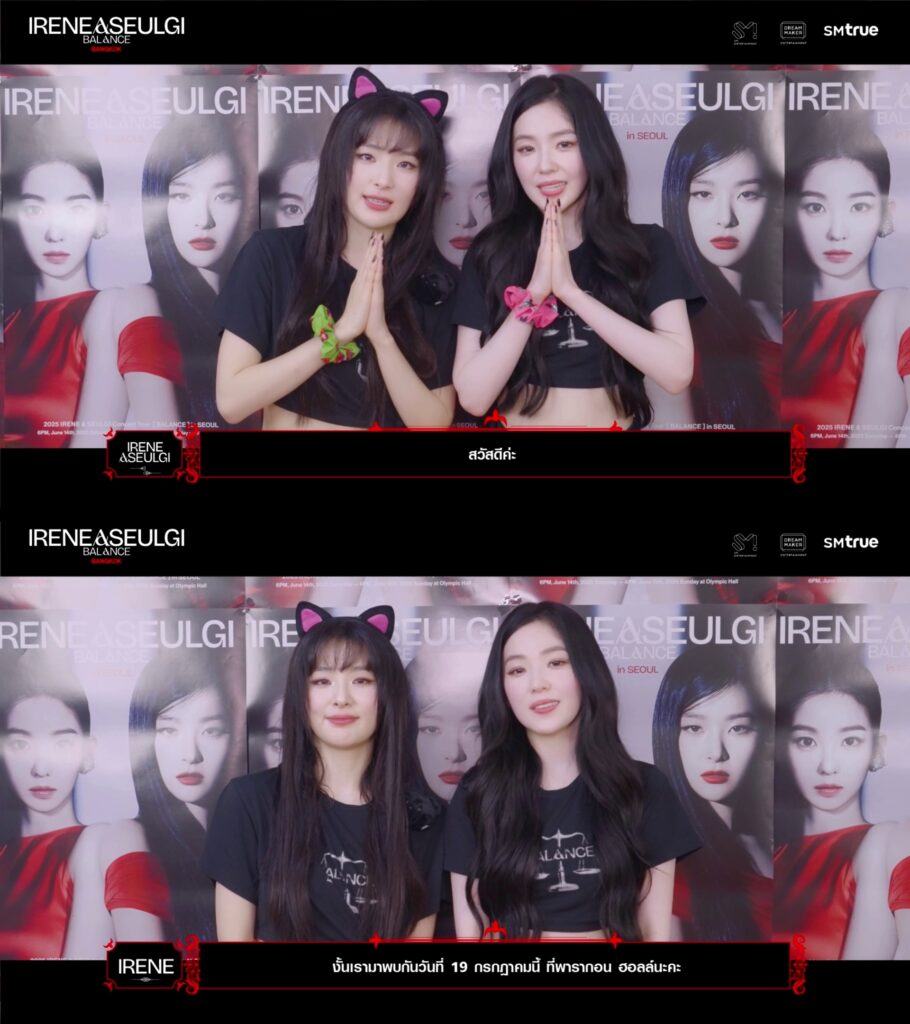 “สวัสดีค่ะ Red Velvet – IRENE & SEULGI (เร้ด เวลเว็ท – ไอรีน แอนด์ ซึลกิ) ค่ะ ในที่สุดเราก็จะได้ไปพบกับ ReVeluv (เรเวเลิฟ) ชาวไทย พร้อมกับ 2025 IRENE & SEULGI Concert Tour [ BALANCE ] in BANGKOK ค่ะ แค่คิดถึงความสมดุลของ IRENE & SEULGI (ไอรีน แอนด์ ซึลกิ) ที่จะเกิดจากพลังความร้อนแรงจาก ReVeluv (เรเวเลิฟ) ชาวไทย