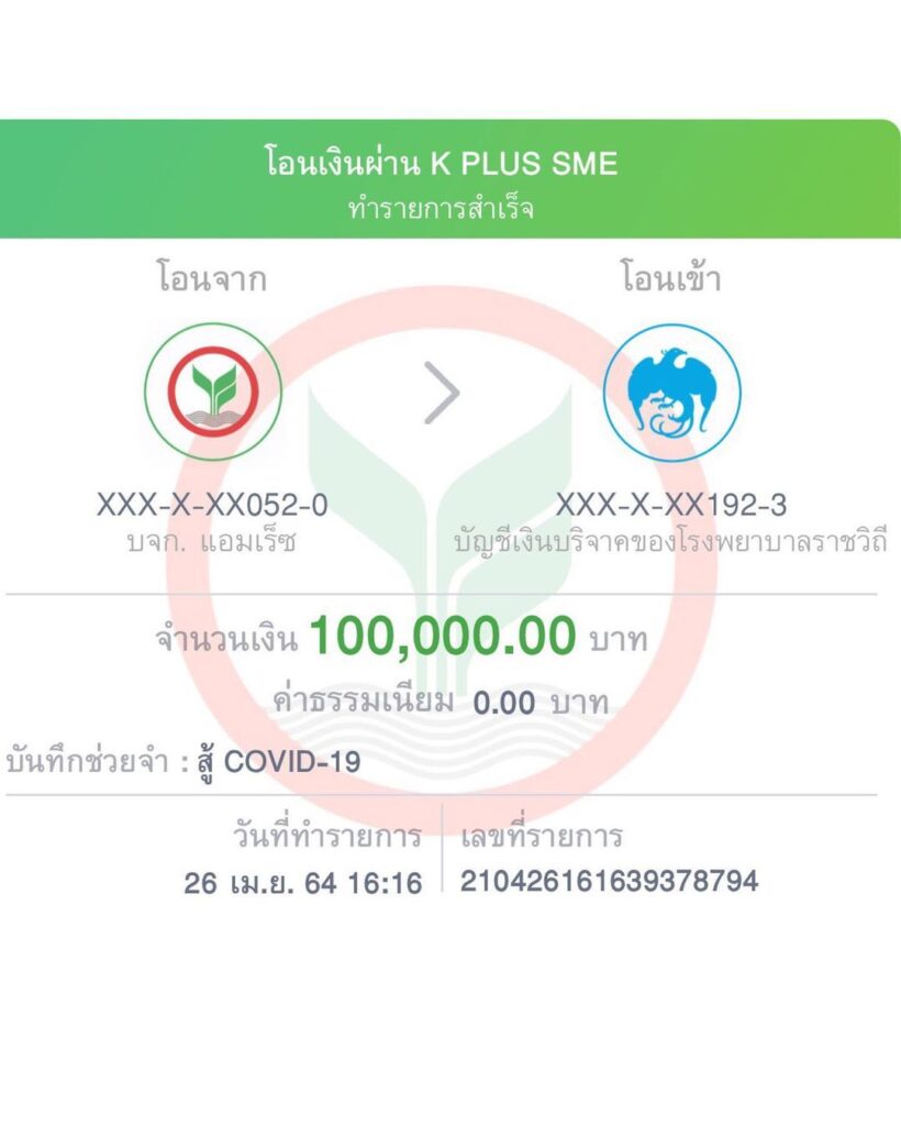 เพื่อสู้โควิด- 19 กับทางโรงพยาบาล ราชวิถี เพื่อนำไปจัดซื้อเครื่องมือและอุปกรณ์การแพทย์ที่ใช้กับผู้ป่วย และเป็นค่าใช้จ่ายอย่างอื่นที่จำเป็นในการรักษาผู้ป่วย