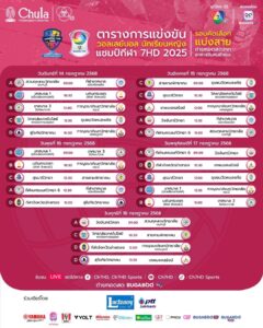 แฟนลูกยางเข้าชมฟรี! เชียร์มันกันต่อในรอบคัดเลือก รอบสอง ระหว่างวันที่ 14-18 กรกฎาคม 2568 (14-17 ก.ค.วันละ 5 คู่ ) และ (18 ก.ค. แข่งขัน 4 คู่) ซึ่งทั้ง 2 รอบจะทำการแข่งขันที่ สนามจันทนยิ่งยง (ลงรถไฟฟ้า สถานีสนามกีฬาแห่งชาติ) พร้อมพบกับเหล่าผู้บรรยายตัวตึง แอดเต้, แอดอาท, แอดม่อน, แอดมุ้ย และผู้บรรยายน้องใหม่ ดิว-ศุภกฤต วณิชเจริญพงษ์ ที่จะมาร่วมบรรยายเกมและสร้างสีสันในวันอังคารที่ 15 ก.ค. 68 และ วันพฤหัสบดีที่ 17 ก.ค. 68 จากนั้นไปต่อด้วยรอบแบ่งกลุ่ม ทำการแข่งขันที่สนามโรงเรียนที่เข้ารอบ ระหว่างวันที่ 29 -31 กรกฎาคม 2568 และ 1, 4, 5 สิงหาคม 2568 ร่วมเชียร์สดทาง เว็บไซต์และแอปพลิเคชัน BUGABOO.TV<http://BUGABOO.TV> โซเชียลมีเดีย YouTube Ch7HD, TikTok Ch7HD Sports, Facebook Ch7HD และ Ch7HD Sports ติดตามรายละเอียดการแข่งขัน และตารางถ่ายทอดสดได้ทาง https://www.ch7.com/champ7hd/volleyball2025/