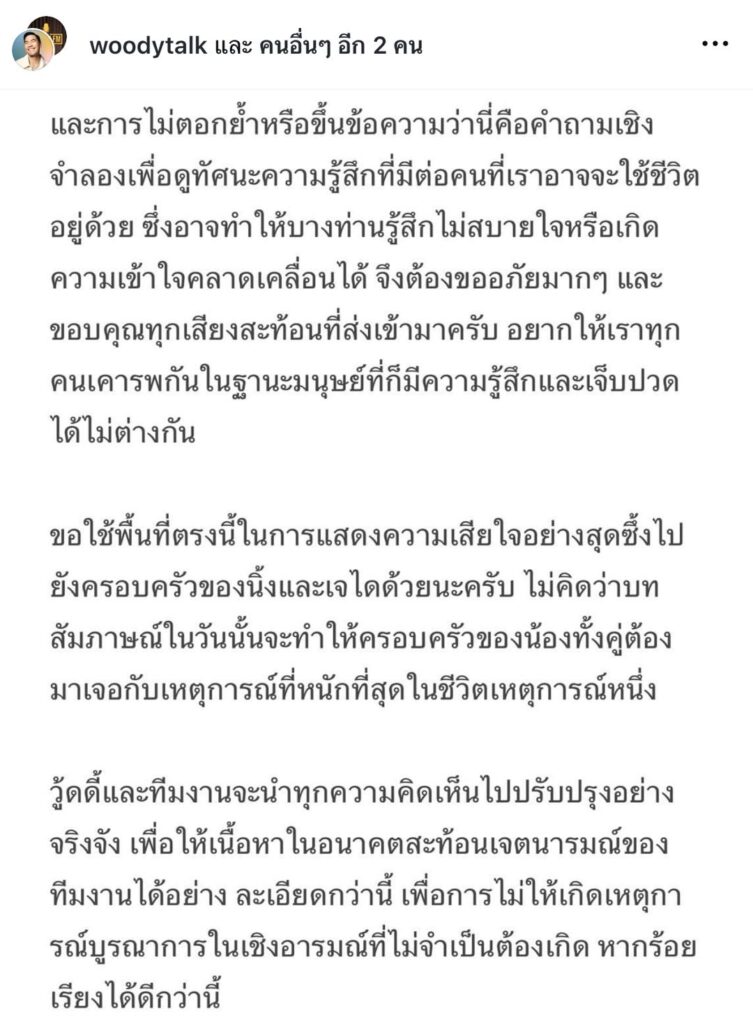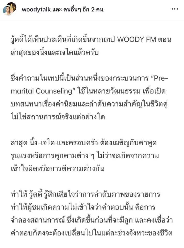 ล่าสุดทางด้าน “วู้ดดี้ วุฒิธร“ พิธีกรและเจ้าของรายการ ได้ออกมาเคลื่อนไหวถึงประเด็นดราม่าดังกล่าว รู้สึกเสียใจกับเหตุการณ์ที่เกิดขึ้น และจะนำไปปรับปรุงอย่างจริงจัง โดยโพสต์ภาพที่เขียนข้อความว่า “วู้ดดี้ได้เห็นประเด็นที่เกิดขึ้นจากเทป WOODY FM ตอนล่าสุดของนิ้งและเจไดแล้วครับ ซึ่งคำถามในเทปนี้เป็นส่วนหนึ่งของกระบวนการ “Pre- marital Counseling” (พรี-มาริทอล-เคาน์เซลลิ่ง)ใช้ในหลายวัฒนธรรม เพื่อเปิด บทสนทนาเรื่องค่านิยมและลำดับความสำคัญในชีวิตคู่ไม่ใช่สถานการณ์จริงแต่อย่างใด ล่าสุด นิ้ง-เจได และครอบครัว ต้องเผชิญกับคำพูดรุนแรงหรือการคุกคามต่าง ๆ ไม่ว่าจะเกิดจากความ เข้าใจผิดหรือการตีความต่างกันทำให้ วู้ดดี้ รู้สึกเสียใจว่าการลำดับภาพของรายการทำให้ผู้ชมเกิดความไม่เข้าใจว่าคำตอบนั้น คือการจำลองสถานการณ์ ซึ่งเกิดขึ้นก่อนที่จะมีลูก และคงเชื่อว่า คำตอบก็คงจะต้องเปลี่ยนไปในแต่ละช่วงจังหวะของชีวิต และการไม่ตอกย้ำหรือขึ้นข้อความว่านี่คือคำถามามเชิง จำลองเพื่อดูทัศนะความรู้สึกที่มีต่อคนที่เราอาจจะใช้ชีวิต อยู่ด้วย ซึ่งอาจทำให้บางท่านรู้สึกไม่สบายใจหรือเกิด ความเข้าใจคลาดเคลื่อนได้ จึงต้องขออภัยมากๆ และ ขอบคุณทุกเสียงสะท้อนที่ส่งเข้ามาครับ อยากให้เราทุก คนเคารพกันในฐานะมนุษย์ที่ก็มีความรู้สึกและเจ็บปวด ได้ไม่ต่างกันขอใช้พื้นที่ตรงนี้ในการแสดงความเสียใจอย่างสุดซึ้งไปยังครอบครัวของนิ้งและเจไดด้วยนะครับ ไม่คิดว่าบทสัมภาษณ์ในวันนั้นจะทำให้ครอบครัวของน้องทั้งคู่ต้องมาเจอกับเหตุการณ์ที่หนักที่สุดในชีวิตเหตุการณ์หนึ่ง วู้ดดี้และทีมงานจะนำทุกความคิดเห็นไปปรับปรุงอย่างจริงจัง เพื่อให้เนื้อหาในอนาคตสะท้อนเจตนารมณ์ของทีมงานได้อย่าง ละเอียดกว่านี้ เพื่อการไม่ให้เกิดเหตุการณ์บูรณาการในเชิงอารมณ์ที่ไม่จำเป็นต้องเกิด หากร้อยเรียงได้ดีกว่านี้