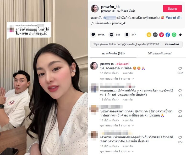 ล่าสุดหลังจากนั้นไม่นานทางด้าน “พราวฟ้า” จึงได้มาโพสต์คลิปตอบชาวเน็ต โดยในคลิป “เสี่ยโบ๊ท” บอกว่า “น่าจะเป็นคุณพี่ที่มีอายุสักนิดหนึ่งแล้วคนนี้ ไม่เป็นไรไม่โกรธกัน ถือว่าอาจจะเข้าใจผิด ไม่ได้ให้ลูกไปหาเงิน แค่เอาลูกไปถ่าย เพื่อเก็บไว้เป็นความทรงจำ เพราะลูกก็คงจะอายุแค่ 3 อาทิตย์ แค่ครั้งเดียวในชีวิต ก่อนจะครบ 1 เดือน