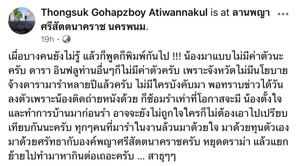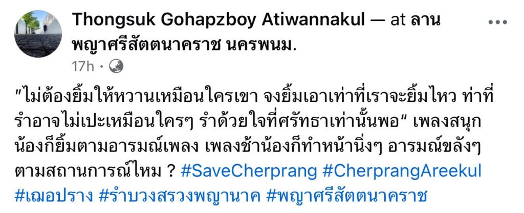 ทุกๆคนที่มารำในงานล้วนมาด้วยใจ มาด้วยทุนตัวเอง มาด้วยศรัทธากับองค์พญาศรีสัตตนาคราชครับ หยุดดราม่า แล้วแยกย้ายไปทำมาหากินต่อเถอะครับ … สาธุๆๆ” และยังได้โพสต์คลิปสาว “เฌอปราง” ขณะรำพร้อมกับแคปชันว่า “ไม่ต้องยิ้มให้หวานเหมือนใครเขา จงยิ้มเอาเท่าที่เราจะยิ้มไหว ท่าที่รำอาจไม่เปะเหมือนใครๆ รำด้วยใจที่ศรัทธาเท่านั้นพอ”