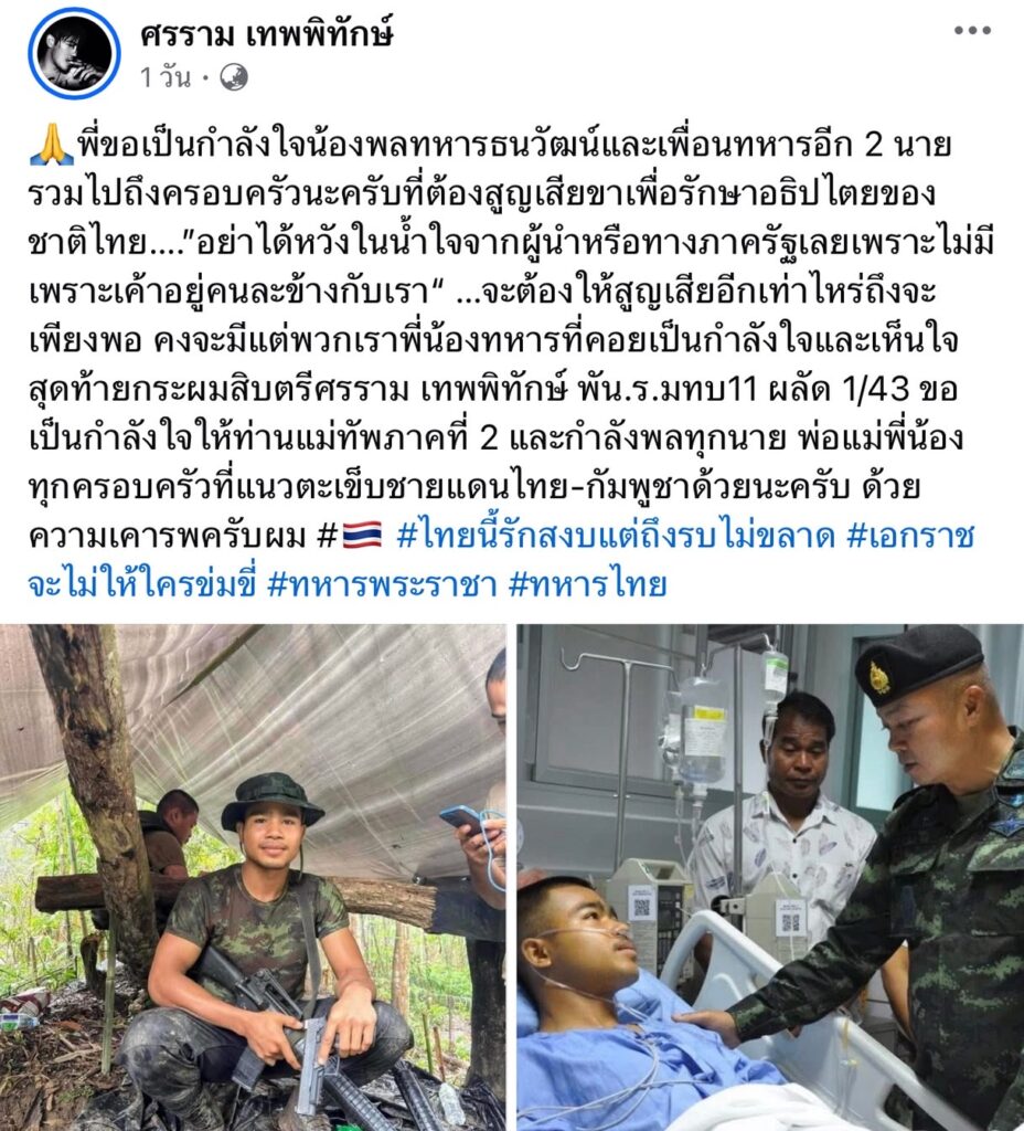 “🙏พี่ขอเป็นกำลังใจน้องพลทหารธนวัฒน์และเพื่อนทหารอีก 2 นายรวมไปถึงครอบครัวนะครับที่ต้องสูญเสียขาเพื่อรักษาอธิปไตยของชาติไทย….”อย่าได้หวังในน้ำใจจากผู้นำหรือทางภาครัฐเลยเพราะไม่มี เพราะเค้าอยู่คนละข้างกับเรา“ …จะต้องให้สูญเสียอีกเท่าไหร่ถึงจะเพียงพอ คงจะมีแต่พวกเราพี่น้องทหารที่คอยเป็นกำลังใจและเห็นใจ สุดท้ายกระผมสิบตรีศรราม เทพพิทักษ์ พัน.ร.มทบ11 ผลัด 1/43 ขอเป็นกำลังใจให้ท่านแม่ทัพภาคที่ 2 และกำลังพลทุกนาย พ่อแม่พี่น้องทุกครอบครัวที่แนวตะเข็บชายแดนไทย-กัมพูชาด้วยนะครับ ด้วยความเคารพครับผม #🇹🇭 #ไทยนี้รักสงบแต่ถึงรบไม่ขลาด #เอกราชจะไม่ให้ใครข่มขี่ #ทหารพระราชา #ทหารไทย”