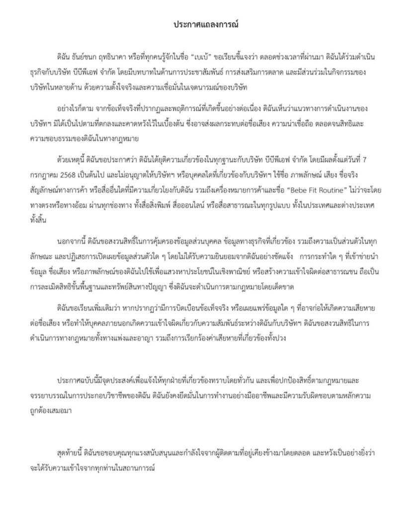 ซึ่งทำเอาหลายคนสงสัยว่าเกิดอะไรขึ้น เมื่อ “เบเบ้” ได้ประกาศยุติบทบาทกับบริษัทชื่อดังที่ทำธุรกิจร่วมกันโดยเธอโพสต์ข้อความว่า “วันนี้เบขอแจ้งให้ทุกคนทราบว่า เบได้ยุติบทบาทและความเกี่ยวข้องทั้งหมดกับบริษัท บีบีพีเอฟ จำกัด ตั้งแต่วันที่ 7 กรกฎาคม 2568 เป็นต้นไป