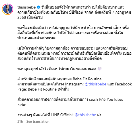 สามารถติดตามอัปเดตได้ทาง Instagram: @thisisbebe และ Facebook Page: Bebe Fit Routine เท่านั้น