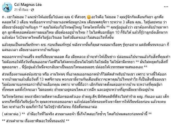 งานนี้ดูท่าไม่จบง่ายๆ เพราะทางด้าน “ซี” อดีตภรรยา “แม็กซ์” ก็ได้ออกมาเคลื่อนไหวผ่านทางเฟซบุ๊กส่วนตัวหลังจากโดนพาดพิงพร้อมกับโต้กลับอีกฝ่ายว่า “ก . เขาไม่ยอม ? แนะนำให้เอ่ยชื่อไปเลย คุณ C ที่สวยๆ อะไรคือ ไม่ยอม ? คุณรู้จักกันเดือนกันยา ลูกพึงคลอดได้ 3 เดือน จนนี่ออกจากบ้านมาเองพร้อมลูก2คน เดือนพศฤจิกา ระหว่าง 3 เดือน คุณ.. ไม่รู้เลยหรอ ว่าเมียเขายังอยู่บ้านกับลูก ** คุณไม่ต้องไปโทษผู้ใหญ่ โทษใครทั้งนั้น ** คุณรู้อยู่แล้วว่า เขาต้องกลับบ้านมาหาลูก ลูกพึงคลอดต้องทานมแม่ไหม เมียต้องอยู่บ้านไหม ? ในไลฟ์บอกมีลูก 10 ก็รับได้ แล้วก็รู้ว่าลูกยังเล็กมาก แล้วต้อง โx่ขนาดไหนถึงไม่รู้อะไรเลย ในหัวมีแต่จะเอาไม่สนอะไรทั้งนั้น