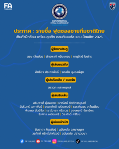 ทั้งนี้ นักฟุตซอลที่มีรายชื่อดังกล่าว จะเข้ารายงานตัว ณ อาคาร FA THAILAND ในวันที่ 22 กรกฎาคม 2568 เวลา 15.00 น. ก่อนจะฝึกซ้อมต่อในเวลา 16.00 น. และจะมีการคัดเลือกผู้เล่นให้เหลือ 16 คนสุดท้าย เพื่อเข้าทัวร์นาเมนต์อย่างเป็นทางการ ต่อไป