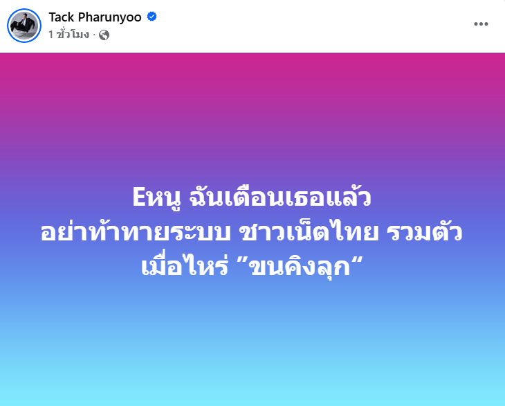 ซึ่งล่าสุด “แทค” ถึงขั้นเดือดจัดโดยโพสต์ข้อความว่า “จะเก่งอะไรก็เก่งไป แต่อย่ามาเก่งกับ ชาวเน็ตไทย คนละชั้น… ( อ่อนด๋อน )” , “Eหนู ฉันเตือนเธอแล้ว