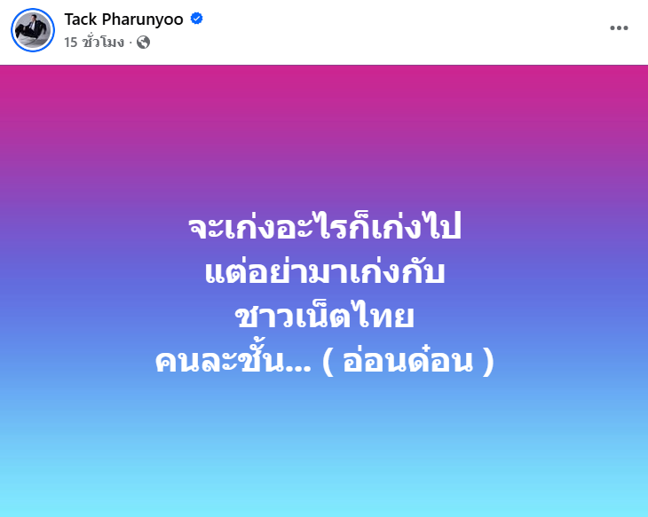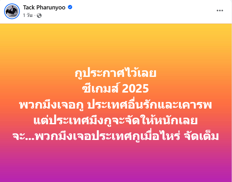 โดยหนุ่ม “แทค ภรัณยู” ก็ได้ออกมาเคลื่อนไหวเกี่ยวกับประเด็นนี้เช่นกัน เขาโพสต์ว่า “กูประกาศไว้เลย ซีเกมส์ 2025 พวกมึงเจอกู ประเทศอื่นรักและเคารพ แต่ประเทศมึงกูจะจัดให้หนักเลยจะ…พวกมึงเจอประเทศกูเมื่อไหร่ จัดเต็ม”