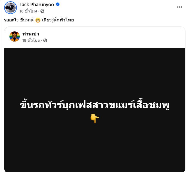 อีกทั้งยังได้แชร์โพสต์ของเพจดัง “ท่านเปา” ที่เกี่ยวกับสาวกัมพูชาที่ระบุข้อความว่า “ขึ้นรถทัวร์บุกเฟสสาวขแมร์เสื้อชมพู”