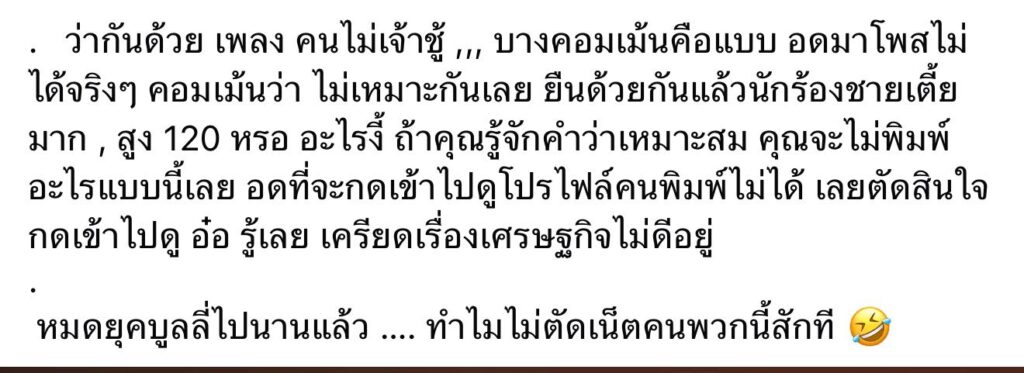 งานนี้ทางด้านสาว “จ๊ะ” ก็ไม่พลาดออกมาโพสต์เดือดว่า “ว่ากันด้วย เพลง คนไม่เจ้าชู้ ,,, บางคอมเม้นคือแบบ อดมาโพสไม่ได้จริงๆ คอมเม้นว่า ไม่เหมาะกันเลย ยืนด้วยกันแล้วนักร้องชายเตี้ยมาก , สูง 120 หรอ อะไรงี้ ถ้าคุณรู้จักคำว่าเหมาะสม คุณจะไม่พิมพ์อะไรแบบนี้เลย อดที่จะกดเข้าไปดูโปรไฟล์คนพิมพ์ไม่ได้ เลยตัดสินใจกดเข้าไปดู อ๋อ รู้เลย เครียดเรื่องเศรษฐกิจไม่ดีอยู่