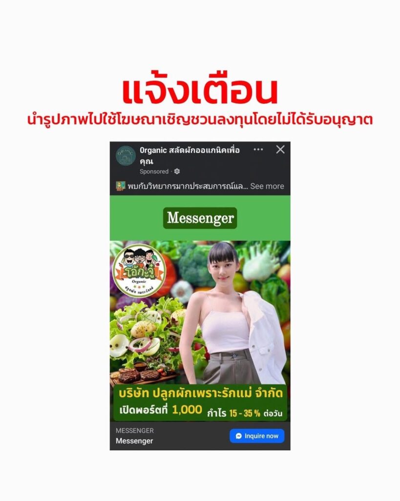 “ทับทิม อัญรินทร์“เตือนภัย! ถูกนำรูปไปแอบอ้างโฆษณาให้ลงทุน วอนอย่าหลงเชื่อ