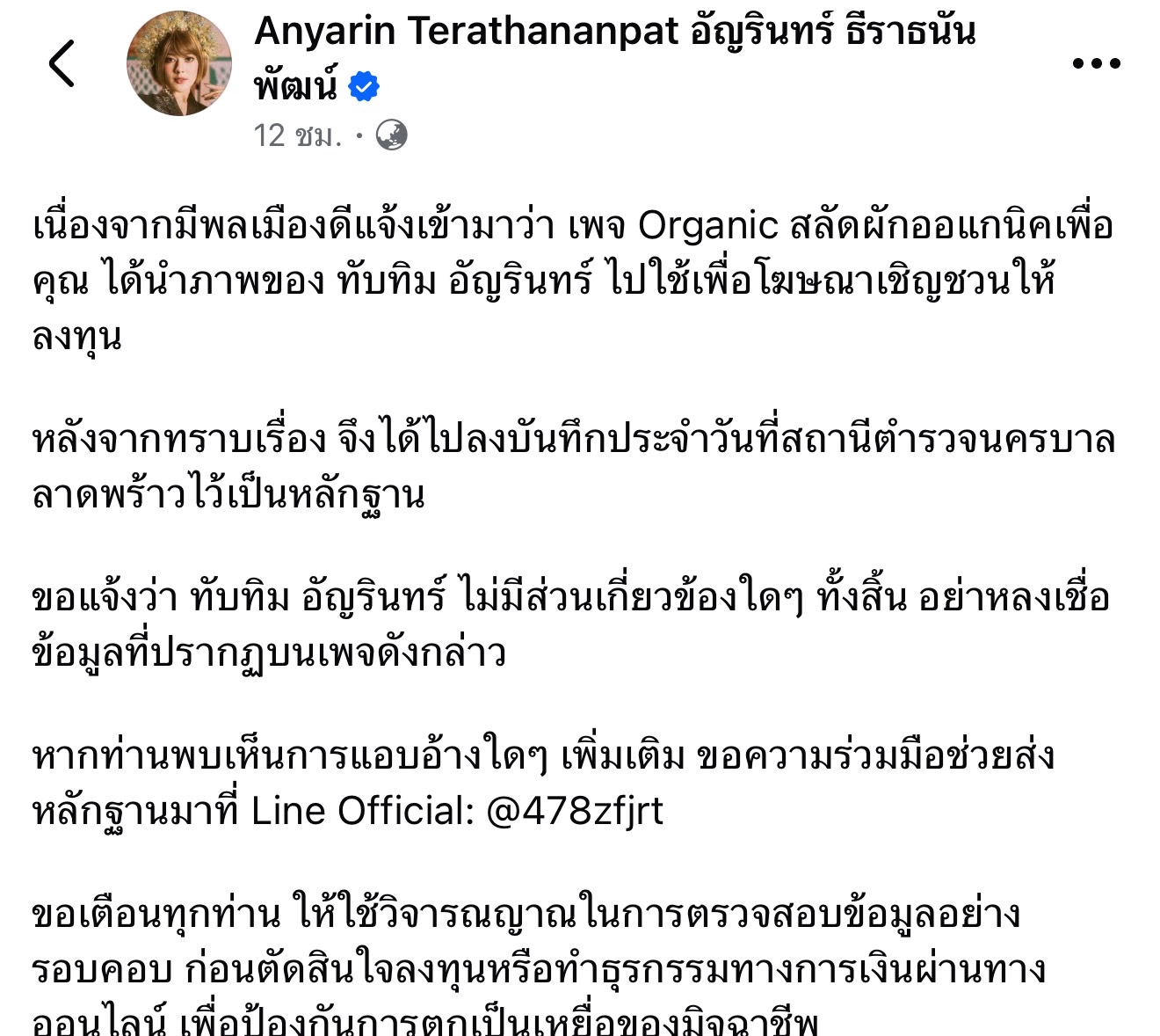 ซึ่งสาว ”ทับทิม“ ก็ออกมาโพสต์ภาพหน้าสถานีตำรวจพร้อมถือใบแจ้งความ และเขียนแคปชั่นว่า ”เนื่องจากมีพลเมืองดีแจ้งเข้ามาว่า เพจ Organic สลัดผักออแกนิคเพื่อคุณ ได้นำภาพของ ทับทิม อัญรินทร์ ไปใช้เพื่อโฆษณาเชิญชวนให้ลงทุน