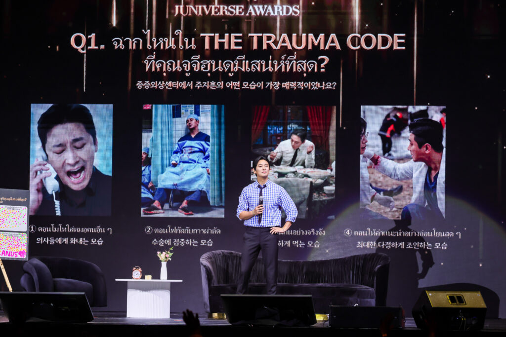 บรรยากาศในฮอลล์เต็มไปความตื่นเต้น และเสียงกรี๊ดจากแฟน ๆ เมื่อจูจีฮุนเปิดตัวกับเสียงร้องสุดละมุนในเพลง ‘You Are In My Arms’ พร้อมรอยยิ้มแสนอบอุ่นราวกับหลุดออกมาจากจอ ก่อนจะพาทุกคนเข้าสู่จักรวาล ‘JUNIVERSE’ พูดคุยแบบเต็มอรรถรสถึงผลงาน และเรื่องราวต่าง ๆ ของเขาอย่างเป็นกันเอง แต่ที่ทำเอาแฟน ๆ กรี๊ดจนแทบเจ็บคอคงหนีไม่พ้นอาการเขินของโอปป้าคนเท่ ที่แอบออกตัวว่าเป็นสเปกของทุกคนเพราะบทบาทในซีรีส์ แต่กลับโดนแฟนคลับตะโกนแซวกลับว่าเพราะความหล่อนี่แหละใช่เลย!!