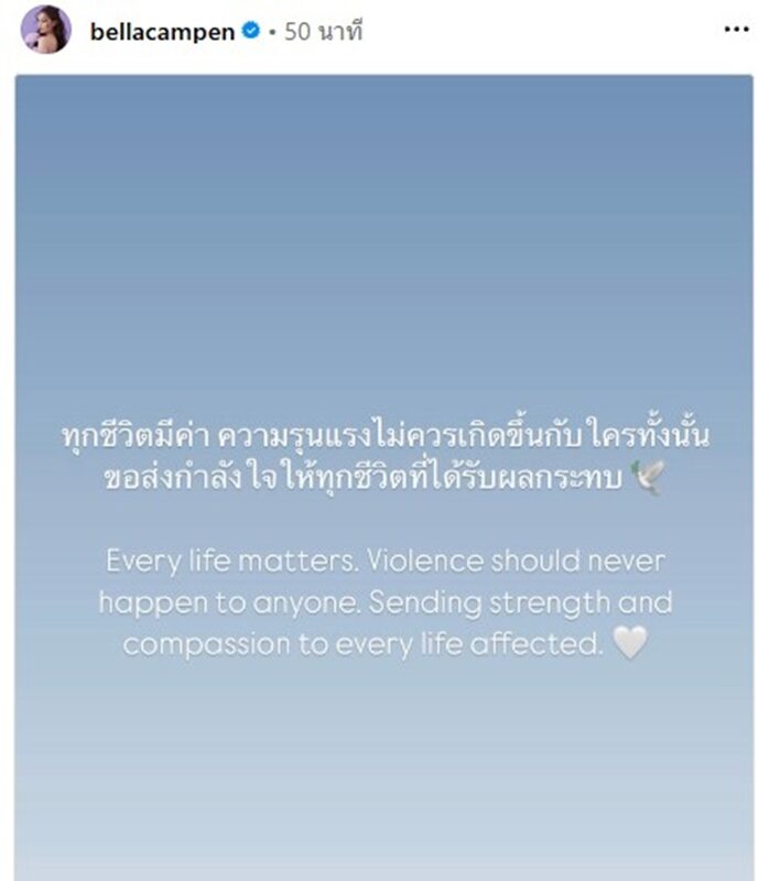 โดยทางด้านนางเอกสาว “เบลล่า ราณี” ได้โพสต์ข้อความเป็นกระบอกเสียงถึงเหตุการณ์ในครั้งนี้เช่นกัน ระบุว่า “ทุกชีวิตมีค่า ความรุนแรงไม่ควรเกิดขึ้นกับใครทั้งนั้นขอส่งกำลังใจให้ทุกชีวิตที่ได้รับผลกระทบ