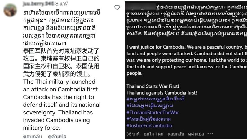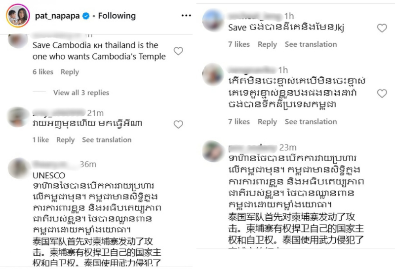 หลังจากโพสต์ถูกเผยแพร่ไปไม่นานก้ได้มีชาวกัมพูชาหลายคนเข้ามาคอมเมนต์ส่วนใหญ่แสดงความไม่พอใจต่อไทย กล่าวหาว่าไทยเป็นฝ่ายเริ่มโจมตีก่อน เรียกร้องให้หยุดรุกราน ย้ำสิทธิ์ของกัมพูชาในการปกป้องอธิปไตย และบางคนพาดพิงเรื่องวัดมรดกโลก และขอความเป็นธรรมจาก UNESCO ซึ่งคอมเมนต์กันเดือดสนั่นจนสาว “แพท” ต้องปิดคอมเมนต์เช่นกัน