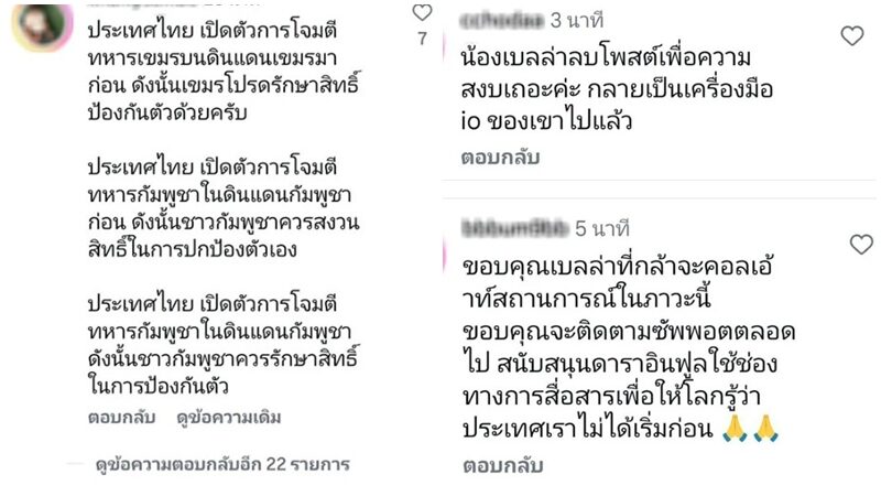 ซึ่งหลังจากนั้นไม่นานเธอก็ต้องรีบปิดคอมเมนต์ทันที เนื่องจากมีชาวกัมพูชาจำนวนมากเข้ามาคอมเมนต์โต้ตอบกล่าวหาว่าไทยเป็นฝ่ายเปิดฉากโจมตีกัมพูชาก่อน แฟนคลับไทยไม่นิ่งเฉยรีบปกป้องและบอกให้ “เบลล่า” รีบปิดคอมเมนต์ทันที