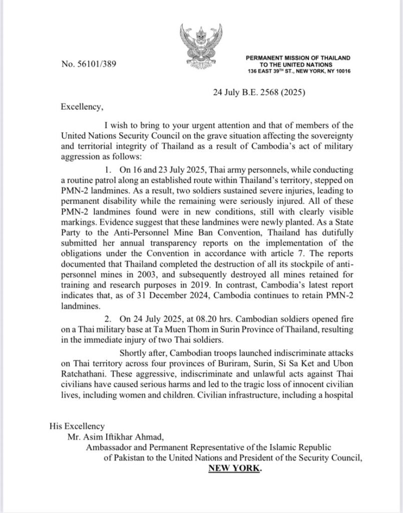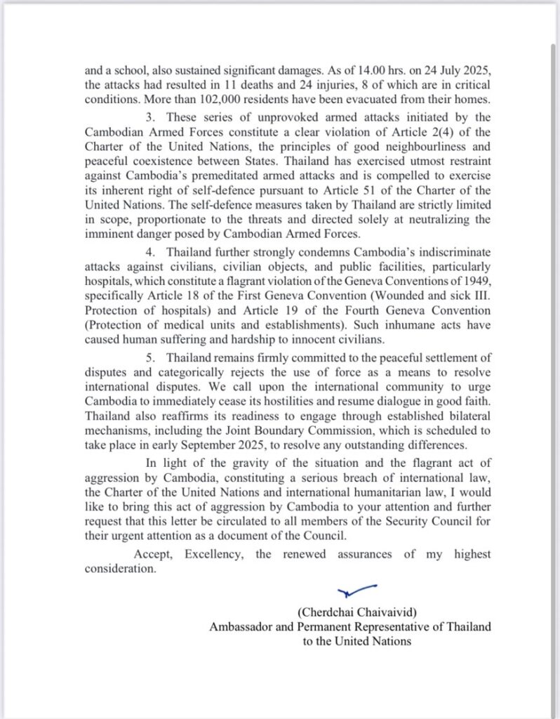 นายเชิดชาย ใช้ไววิทย์ เอกอัครราชทูต ผู้แทนถาวรไทย ประจำสหประชาชาติ ณ นครนิวยอร์ก ระบุว่า ขอแจ้งให้ท่านและสมาชิกคณะมนตรีความมั่นคงแห่งสหประชาชาติทุกท่านทราบถึงสถานการณ์ อันร้ายแรงที่ส่งผลกระทบต่ออธิปไตยและบูรณภาพแห่งดินแดนของไทย อันเป็นผลจากการรุกรานทางทหารของประเทศกัมพูชา โดยมีรายละเอียด ดังนี้