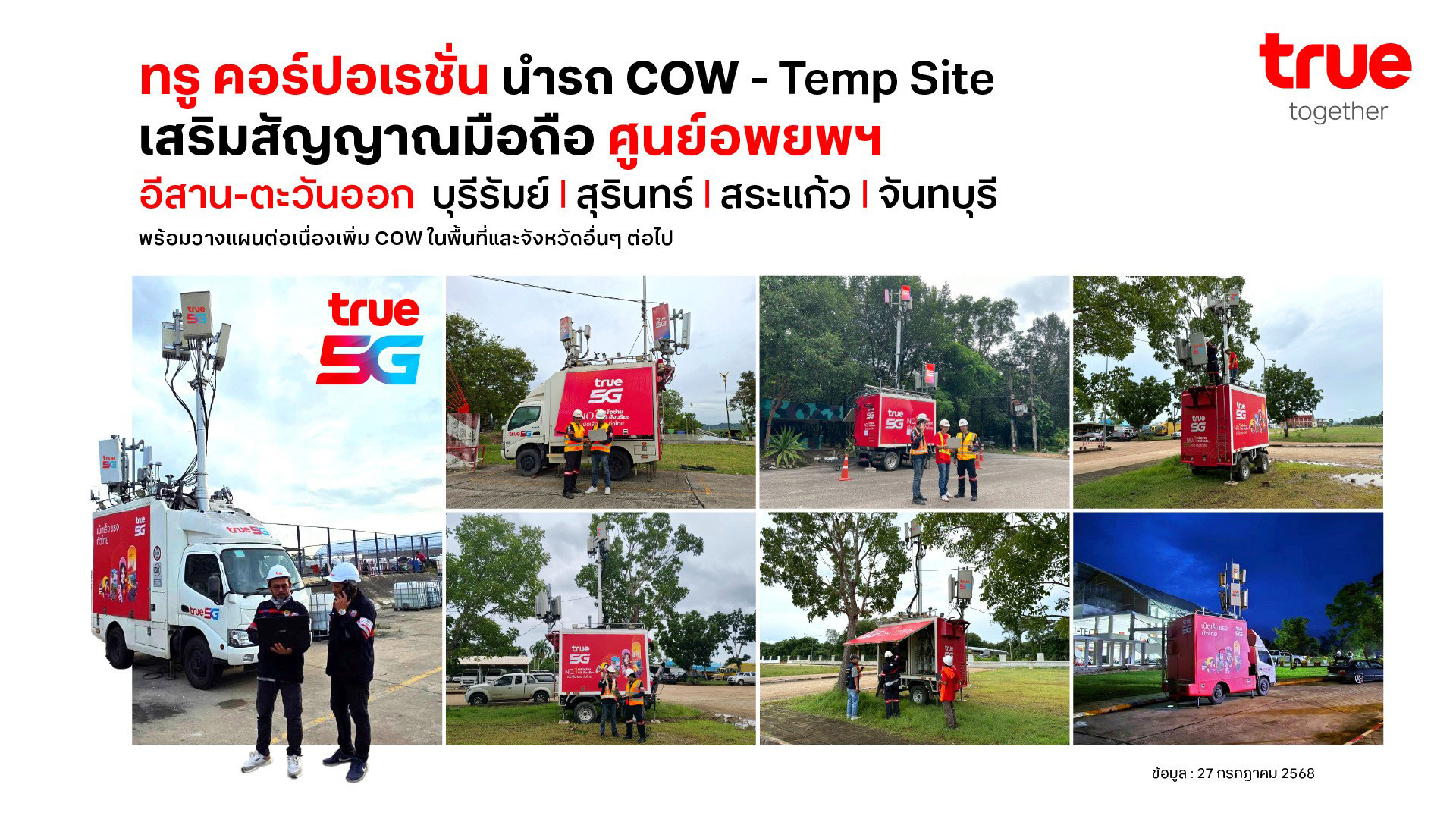 27 กรกฎาคม 2568 – บมจ. ทรู คอร์ปอเรชั่น ห่วงใยประชาชนที่ได้รับผลกระทบจากสถานการณ์การปะทะพื้นที่ชายแดนไทย–กัมพูชา เร่งจัดทัพรถโมบายล์สถานีฐานเคลื่อนที่เร็ว (Cell-On-Wheel: COW) และเสาสัญญาณเฉพาะกิจ (Temporary Site) เข้าไปเสริมสัญญาณมือถือ 5G/4G เพื่อรองรับการใช้งานทั้งการโทรและอินเทอร์เน็ตในศูนย์อพยพต่างๆ และพร้อมใช้งานแล้ว เช่น ที่จังหวัดบุรีรัมย์ สุรินทร์ สระแก้ว และจันทบุรี พร้อมทั้งติดตั้งเสาสัญญาณเฉพาะกิจ (Temporary Site) ที่ ศรีสะเกษ และกำลังจะนำ COW ไปติดตั้งเพิ่ม และวางแผนเพิ่มสัญญาณตามสถานการณ์ในพื้นที่หรือจังหวัดอื่นๆ ต่อไป