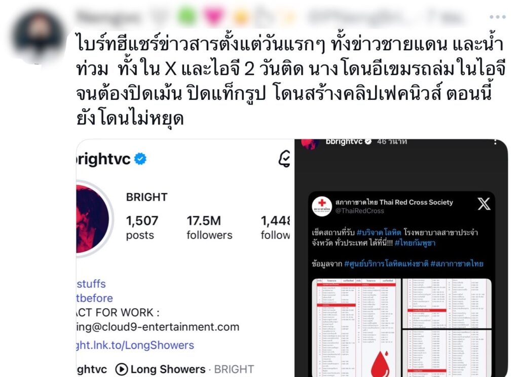 โดยแฟนคลับ ”ไบร์ท วชิรวิชญ์“ เผยว่า ”ไบร์ทฮีแชร์ข่าวสารตั้งแต่วันแรกๆ ทั้งข่าวชายแดน และน้ำท่วม ทั้งใน X และไอจี 2 วันติด นางโดนอีเขมรถล่มในไอจีจนต้องปิดเม้น ปิดแท็กรูป โดนสร้างคลิปเฟคนิวส์ ตอนนี้ยังโดนไม่หยุด “ไบร์ทออกมาแชร์ข่าวสารตั้งแต่วันแรกๆ โดนทัวร์อิขแมร์หนักมาก จนโพสต์ล่าสุดต้องปิดเม้น ปิดการแท็กไอจี ในตตก็โดนปั่นทำคลิปเสียๆหายๆ”