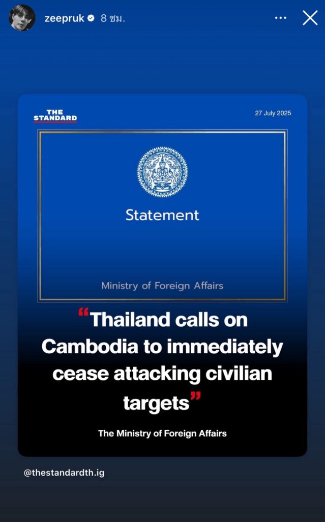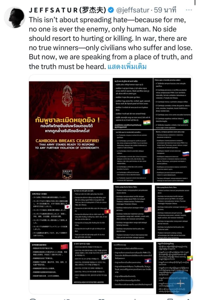 ล่าสุดดูเหมือนสถานการณ์จะคลี่คลายลง เมื่อทางการเจรจาความขัดแย้งชายแดนไทย-กัมพูชาที่ประเทศมาเลเซียโดยเบื้องต้นมีรายงานว่าการเจรจาได้ข้อสรุป ให้ทั้งสองฝ่ายหยุดยิงโดยไม่มีเงื่อนไข แต่หลังจากมติกลับมีเหตุการณ์รุนแรงหนักขึ้น ทำให้ชาวเน็ตไทย และร่วมไปถึงคนในวงการบับเทิง ออกมาโพสต์วิจารณ์และเรียกร้องให้มีการหยุดยิงโดยทันที และชี้แจงความจริงของเหตุการณ์ความขัดแย้ง ไทย – กัมพูชา พร้อมติดแฮชแท็ก #TruthFromThailand ใน X จนขึ้นที่ 1 เทรนด์โลก