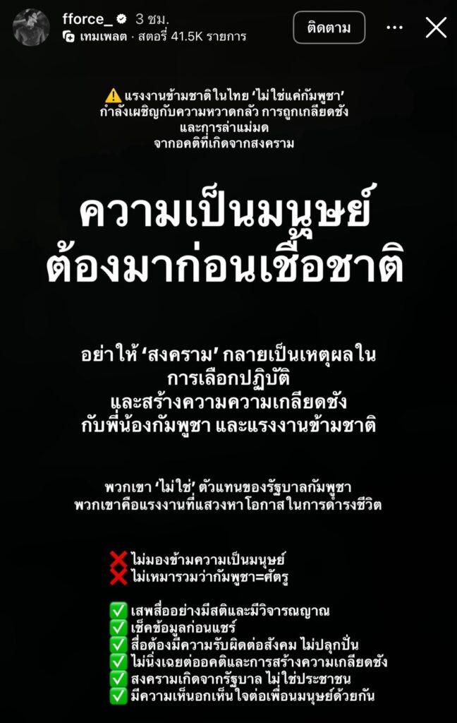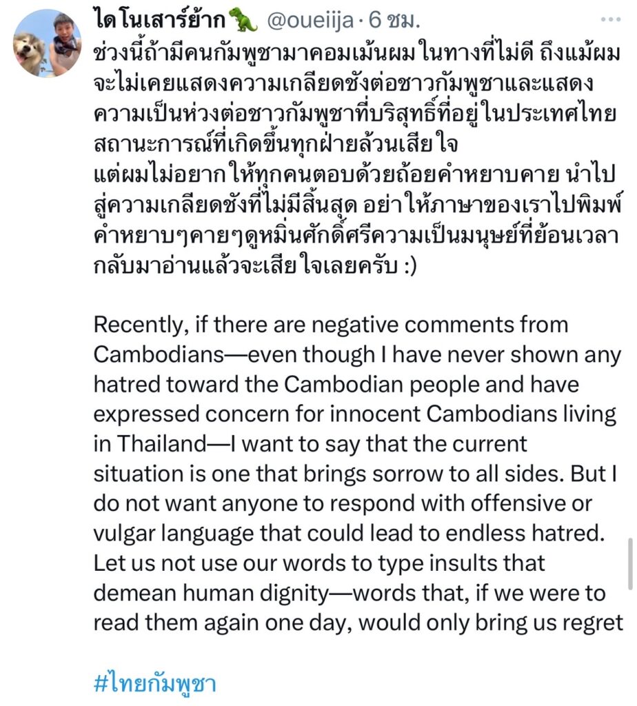 Recently, if there are negative comments from Cambodians—even though I have never shown any hatred toward the Cambodian people and have expressed concern for innocent Cambodians living in Thailand—I want to say that the current situation is one that brings sorrow to all sides. But I do not want anyone to respond with offensive or vulgar language that could lead to endless hatred. Let us not use our words to type insults that demean human dignity—words that, if we were to read them again one day, would only bring us regret