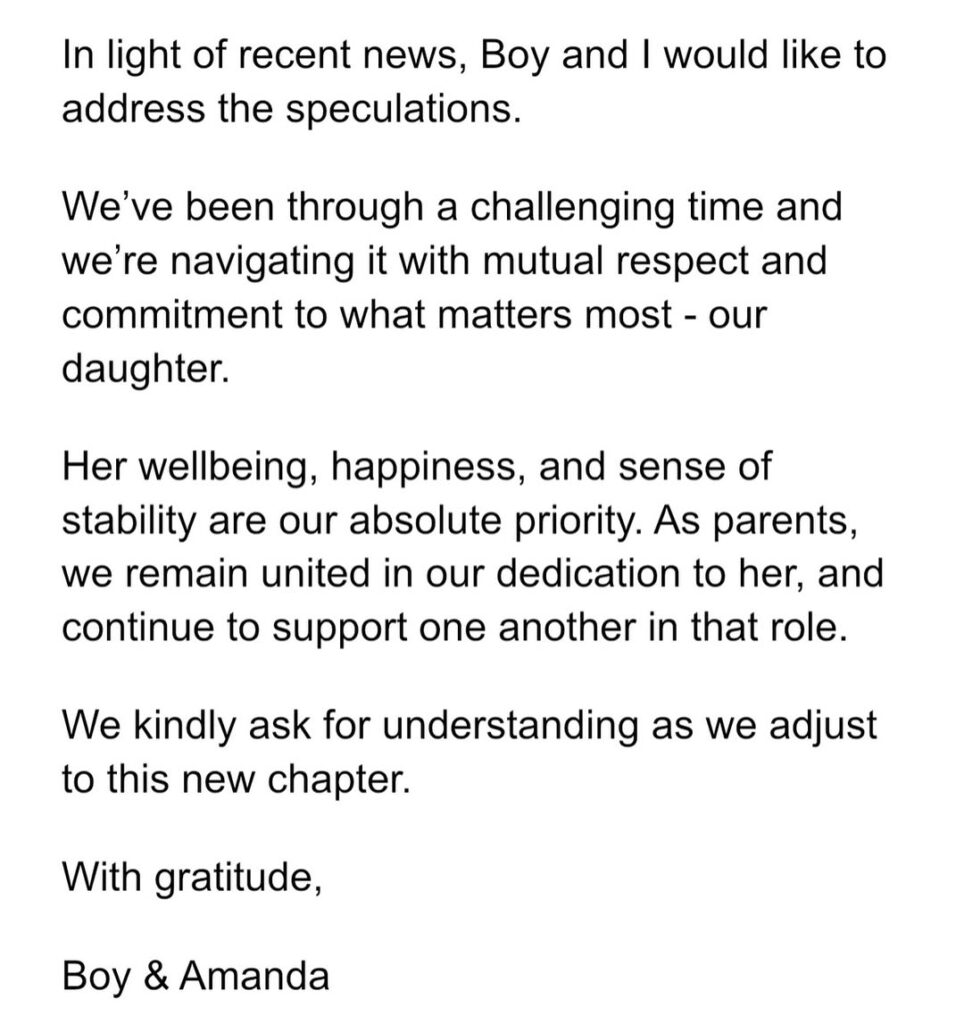 ล่าสุดจากกระแสข่าวลือที่หลายคนยังคงสงสัย “บอย” ได้ออกมาตอบแบบตรง ๆ โดยโพสต์ข้อความว่า “ตามกระแสข่าวที่เกิดขึ้น อแมนด้าและผมอยากขอใช้โอกาสนี้ชี้แจงเรื่องราวต่อทุกท่านครับ ช่วงเวลาที่ผ่านมาไม่ใช่เรื่องง่ายเลยสำหรับเราทั้งคู่ แต่เราจะพยายามก้าวผ่านไปให้ได้ และเราจะทุ่มเทเพื่อสิ่งสำคัญที่สุดในชีวิตของพวกเรา นั่นก็คือเฟรย่า ความสุข ความสบายใจ และความมั่นคงในชีวิตของลูกคือสิ่งที่เราปรารถนามากที่สุด เราจะยังคงร่วมกันทำหน้าที่พ่อและแม่ให้ดีที่สุด และจะคอยสนับสนุนกันและกันเพื่อดูแลให้ลูกเติบโตอย่างที่เราตั้งใจ ขอบคุณทุกความห่วงใยและหวังว่าจะได้รับความเข้าใจจากทุกคนในช่วงเวลานี้นะครับ”