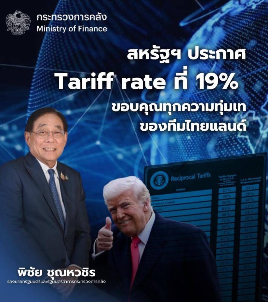 นายพิชัย ชุณหวชิร รองนายกรัฐมนตรี และรัฐมนตรีว่าการกระทรวงการคลัง โพสต์ข้อความผ่านสื่อสังคมออนไลน์ ระบุว่า การประกาศ Tariff rate ที่ 19% สะท้อนถึงมิตรภาพ และความเป็นพันธมิตรที่แน่นแฟ้นระหว่างไทย–สหรัฐฯ ช่วยให้ไทยยังคงแข่งขันได้ในเวทีโลก สร้างความเชื่อมั่นต่อนักลงทุน และเปิดประตูสู่การขยายตัวทางเศรษฐกิจ รายได้ และโอกาสใหม่ๆ ให้กับประเทศไทย