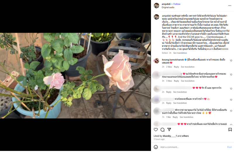 ล่าสุด “แอม” ได้โพสต์คลิปพูดคุยเรื่องดอกไม้ที่ปลูกพร้อมระบะแคปชั่นเพิ่มเติมว่า “ขอพักดูข่าวพักนึง เพราะทำให้ป่วยจริงจังไปเลย ไม่ใช่อุปมานะคะ แต่ปวดไมเกรนอ้วกนอนซมไปเลย นอนน้ำตาไหลด้วยความเจ็บใจ…. เกิดมายังไม่เคยเห็นบ้านเมืองไหนโกหกตาใส หน้าด้านเท่าอีเมืองนี่เลย ภาษากาย ภาษาห่านอะไร ก็้เชื่อว่าแม้แต่ ดร.ตฤณ ก็ยังไม่รับวิเคราะห์ โจมตีเรา ลอบกัดเรา เรายังต้องรับคนของเขามารักษา ก็โรงพยาบาลเรา หมอเรา แล้วคุณต้องเป็นคนคบไม่ได้แค่ไหน จึงยังเอาเราไปตีหน้าเศร้า เล่าความเท็จให้ชาวโลกสงสารได้อีก คุยเรื่องดอกไม้สักวันละกัน…..🌹🌹🌹