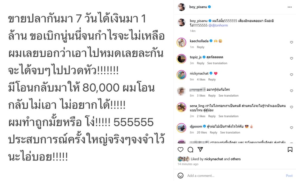 ล่าสุด “บอย” ได้โพสต์ข้อความว่า “ขายปลากันมา 7 วัน ได้เงินมา 1 ล้าน ขอเบิกนู่นนี่จนกำไรจะไม่เหลือ ผมเลยบอกว่าเอาไปหมดเลยละกัน จะได้จบๆไป ปวดหัว!!!!!