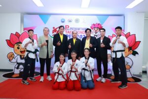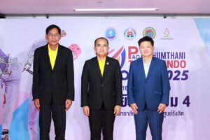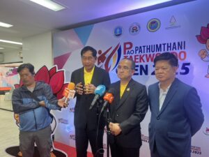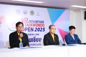 นายสมคิด จันทมฤก ผู้ว่าราชการจังหวัดปทุมธานี, ”บิ๊กแจ๊ส“ พลตำรวจโท คำรณวิทย์ ธูปกระจ่าง นายกองค์การบริหารส่วนจังหวัดปทุมธานี และ นายยรรยง อัครจินดานนท์ ผู้อำนวยการสำนักงานบริหารทรัพย์สินและกีฬา ม. ธรรมศาสตร์ รังสิต ร่วมเป็นประธานแถลงข่าวโครงการแข่งขัน ”มหกรรมส่งเสริมความเป็นเลิศกีฬาเทควันโด 2025“ เมื่อวันที่ 1 สิงหาคม 68 ที่ผ่านมา ณ ห้องประชุมวีไอพี ศูนย์กีฬาทางน้ำ ม. ธรรมศาสตร์ รังสิต โดยมีแขกผู้มีเกียรติและคณะกรรมการฝ่ายจัดการแข่งขันร่วมงานกันอย่างคับคั่ง