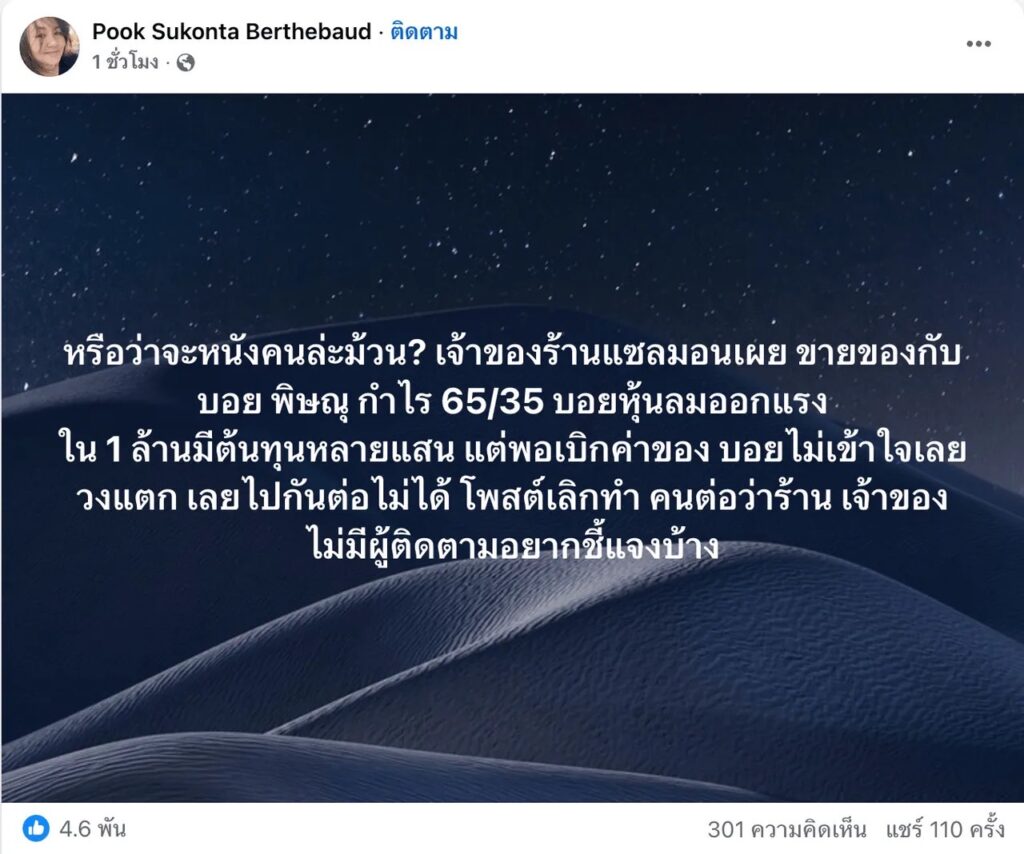 ต่อมาทางด้านเพจ Pook Sukonta Berthebaud ออกมาโพสต์เรื่องราวของ “บอย ภิษณุ ”ว่า”หรือว่าจะหนังคนล่ะม้วน? เจ้าของร้านแซลมอนเผย ขายของกับบอย ภิษณุ กำไร 65/35 บอยหุ้นลมออกแรง ใน 1 ล้านมีต้นทุนหลายแสน แต่พอเบิกค่าของ บอยไม่เข้าใจเลยวงแตก เลยไปกันต่อไม่ได้ โพสต์เลิกทำ คนต่อว่าร้าน เจ้าของไม่มีผู้ติดตามอยากชี้แจงบ้าง”