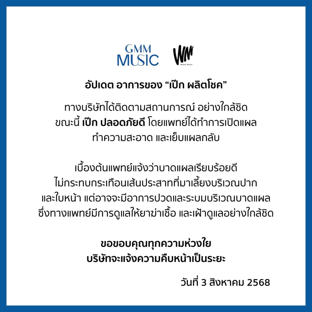 ต่อมาทางด้าต้นสังกัด ได้โพสต์โดยระบุข้อความว่า “บริษัทได้ติดตามสถานการณ์อย่างใกล้ชิด ขณะนี้ เป๊ก ผลิตโชค ปลอดภัยดี โดยแพทย์ได้ทำการเปิดแผลทำความสะอาดและเย็บแผลกลับ