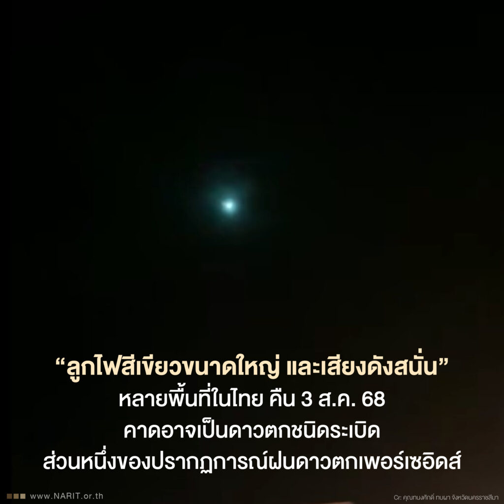 สดร.ชี้แจง”ลูกไฟสีเขียวใหญ่บนฟ้า-เสียงดังสนั่น” หลายพื้นที่ในไทย ช่วงคืน 3 สิงหาคม 2568 คาดอาจเป็นดาวตกชนิดระเบิด ส่วนหนึ่งของปรากฏการณ์ฝนดาวตกเพอร์เซอิดส์
