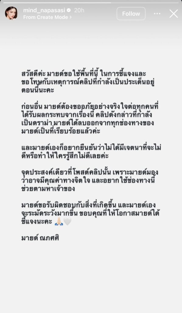 จนทำให้ต่อมาสาว “มายด์ ณภศศิ” ต้องรีบออกมาชี้แจงถึงดราม่าดังกล่าวลงในไอจีสตอรี่ โดยระบุว่า “สวัสดีค่ะ มายด์ขอใช้พื้นที่นี้ในการชี้แจงและขอโทษกับเหตุการณ์คลิปที่กำลังเป็นประเด็นอยู่ตอนนี้นะคะ ก่อนอื่นมายด์ต้องขออภัยอย่างจริงใจต่อทุกคนที่ได้รับผลกระทบจากเรื่องนี้ คลิปดังกล่าวที่กำลังเป็นดรามา มายด์ได้ลบออกจากทุกช่องทางของมายด์เป็นที่เรียบร้อยแล้วค่ะ และมายด์เองก็อยากยืนยันว่าไม่ได้มีเจตนาที่จะไม่ดีหรือทำให้ใครรู้สึกไม่ดีเลยค่ะ จุดประสงค์เดียวที่โพสต์คลิปนั้น เพราะมายด์มองว่าอาจมีคุณค่าทางจิตใจ และอยากใช้ช่องทางนี้ ช่วยตามหาเจ้าของ มายด์ขอรับผิดชอบกับสิ่งที่เกิดขึ้น และมายด์เอง จะระมัดระวังมากขึ้น ขอบคุณที่ให้โอกาสมายด์ได้ชี้แจงนะคะ มายด์ ณภศศิ”