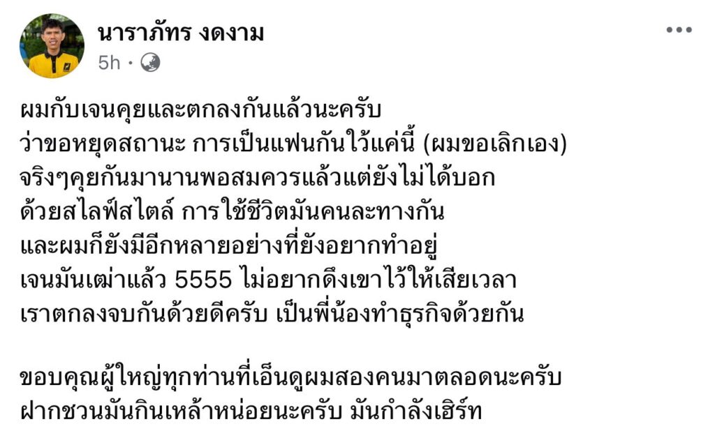 แต่ล่าสุด “หมอแจ็ค” ได้ออกมาโพสต์ผ่านเฟซบุ๊กส่วนตัวว่าตนนั้นได้เลิกรากับภรรยาสาวแล้ว โดยระบุข้อความว่า “ผมกับเจนคุยและตกลงกันแล้วนะครับ ว่าขอหยุดสถานะ การเป็นแฟนกันใว้แค่นี้ (ผมขอเลิกเอง) จริงๆคุยกันมานานพอสมควรแล้วแต่ยังไม่ได้บอก ด้วยสไลฟ์สไตล์ การใช้ชีวิตมันคนละทางกัน และผมก็ยังมีอีกหลายอย่างที่ยังอยากทำอยู่ เจนมันเฒ่าแล้ว 5555 ไม่อยากดึงเขาไว้ให้เสียเวลา เราตกลงจบกันด้วยดีครับ เป็นพี่น้องทำธุรกิจด้วยกัน ขอบคุณผู้ใหญ่ทุกท่านที่เอ็นดูผมสองคนมาตลอดนะครับ ฝากชวนมันกินเหล้าหน่อยนะครับ มันกำลังเฮิร์ท” งานนี้ได้มีเพื่อนๆ และแฟนคลับต่างเข้ามาคอมเมนต์ให้กำลังใจเป็นจำนวนมาก