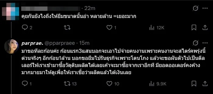 หลังจากที่โพสต์ถูกเผยแพร่ไปก็มีชาวเน็ตเข้ามาไถ่ถามกันมากมาย โดย “ผ้าแพร” ได้ตอบคอมเมนต์ชาวเน็ตว่า “ตั้งใจเข้ามาหลอกแต่แรก มาขอทีละก้อนค่ะ ก้อนแรก3แสนบอกจะเอาไปจ่ายคนงานเพราะคนงานจะสไตรค์พรุ่งนี้ด่วนจริงๆ อีกก้อน1ล้น บอกขอไปรันธุรกิจเพราะโดนโกง แล้วจะขอผันตัวไปเป็นดีลเลอร์ให้เราเข้ามาซื้อวัตถุดิบผลิตได้เลยเค้าจะมาซื้อจากเราอีกที มียอดออเดอร์คงค้างมากมายมาให้ดูเพื่อให้เราเชื่อว่าผลิตแล้วได้เงินเลย”