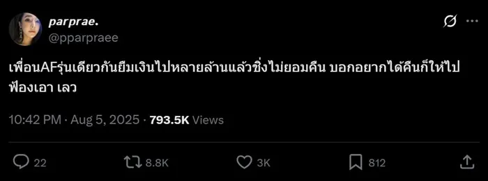 เรียกได้ว่ากลายเป็นประเด็นเดือดในสังคมโซเชียลทันทีเมื่อ “ผ้าแพร ธรัญญ่า” หรือ “ผ้าแพร AF7” อดีตนักร้องสาวจากเวทีการประกวด Academy Fantasia ซีซั่น 7 ได้มาโพสต์ข้อความใน X (Twitter) โดยระบุว่า “”เพื่อน AF รุ่นเดียวกันยืมเงินไปหลายล้านแล้วชิ่งไม่ยอมคืน บอกอยากได้คืน ก็ให้ไปฟ้องเอา เลว”