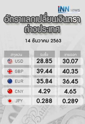 อัตราแลกเปลี่ยนเงินตราต่างประเทศของธนาคารกสิกรไทย ประจำวันจันทร์ที่ 14 ธันวาคม 2563 เมื่อเวลา 07.01 น. มีดังนี้ ดอลลาร์สหรัฐ รับซื้อ 28.85 บาท ขายออก 30.07 บาท ยูโรอยู่ที่ระดับ 36.45 บาทต่อยูโร ปอนด์อยู่ที่ 40.35 บาทต่อปอนด์ เงินหยวนของจีนอยู่ที่ 4.65 บาทต่อหยวน และเงินเยนของญี่ปุ่นอยู่ที่ 0.289 บาทต่อเยน