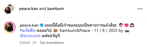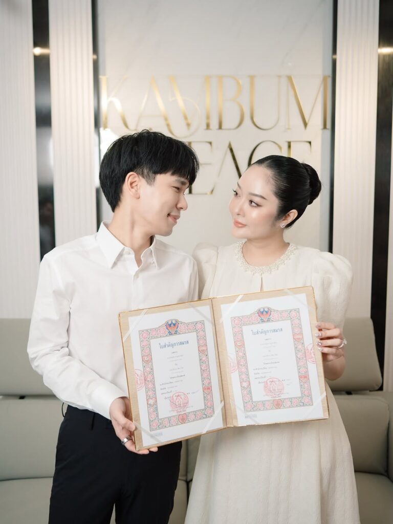 ล่าสุดทำเอาแฟนคลับปลื้มอีกครั้งเมื่อทั้งคู่ได้ถือฤกษ์งามยามดีจดทะเบียนสมรส โดย “พีท” ได้โพสต์รูปภาพคู่ “แก้มบุ๋ม” พร้อมระบุข้อความว่า “แบบนี้คือมีเจ้าของแบบเป็นทางการแล้วสินะ 👦🏻♥️👩🏻 #แก้มพีท ตลอดไป 😂 Kambum&Peace – 11 / 8 / 2025 by 📸 @bine.einb แฟนขวัญจิ”
